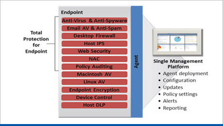 This solution can protect endpoints (server, desktop, laptop, application) with a combination of host-based firewall, intrusion prevention, zero-update attack protection and signature-based antivirus in a single agent. This unique blend of capabilities defends servers and desktops against sophisticated zero-day attacks and enforces acceptable-use and compliance policies within a simple management infrastructure.